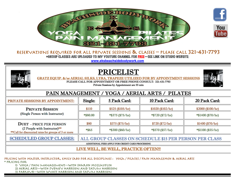 THE STUDIO IS OPEN FOR PRIVATE, DUET and GROUP SESSIONS BY APPOINTMENT AND OFFERS GROUP CLASSES BY RESERVATION. PRACTITIONERS ARE FREE TO REQUEST A YOGA, PILATES OR AERIAL ARTS PRACTICE OR A COMBINATION OF ALL THREE IN ANY GIVEN PRIVATE SESSION. PAIN MANAGEMENT SESSIONS CAN BE BLENDED WITH OTHER DISCIPLINES ONCE PAIN SUBSIDES TO A SUFFICIENT DEGREE. PLEASE CALL STUDIO OWNER, EMILY SABO @ (321) 431-7793, IN ADVANCE TO SCHEDULE A SESSION, RESERVE A SPOT IN A GROUP CLASS OR TO DISCUSS YOUR PARTICULAR PAIN MANAGEMENT CASE AND SCHEDULE A FREE CONSULT.